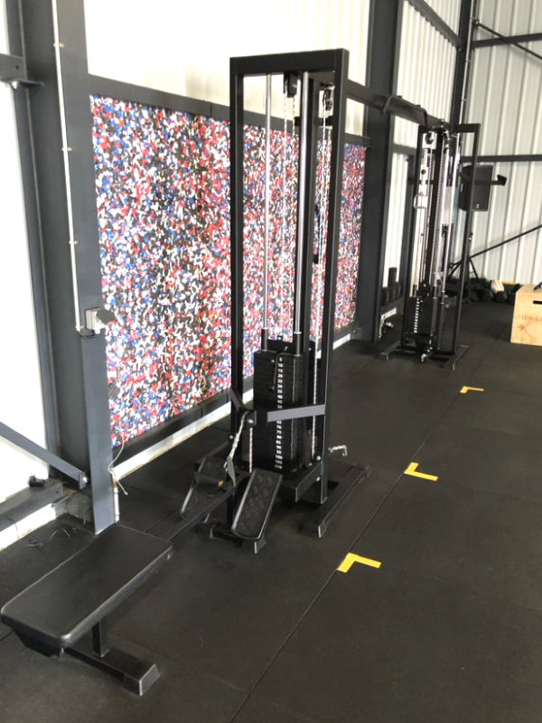 Poulie vis à vis avec poulie haute + poulie basse. Chaque poulie dispose de plaques de charges indépendantes.