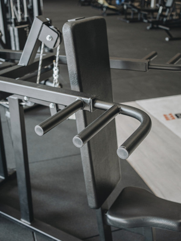 Travail des muscles deltoïdes (épaules) avec participation du haut des trapèzes, des triceps et du muscle dentelé en position assise; la sollicitation musculaire s'effectue en poussant verticalement l'appareil.