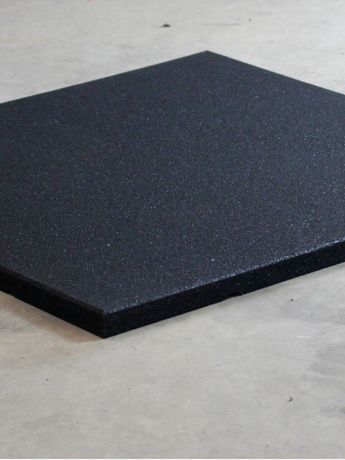 Dalles amortissantes en caoutchouc noir à double couche (amorti gros grain + grain fin de finition) compressées, de 100cm x 100cm conçues spécialement pour la pratique du CrossTraining: le revêtement de sol idéal pour équiper les salles de sports, box affiliées CrossFit®, Fitness et home gym. Très denses (950kg/m³), les dalles vont amortir et absorber les chocs des jetées de barres. Aspect ultra lisse en surface afin de faciliter l'entretien et le nettoyage, ces dalles ne perdent pas leur grain.