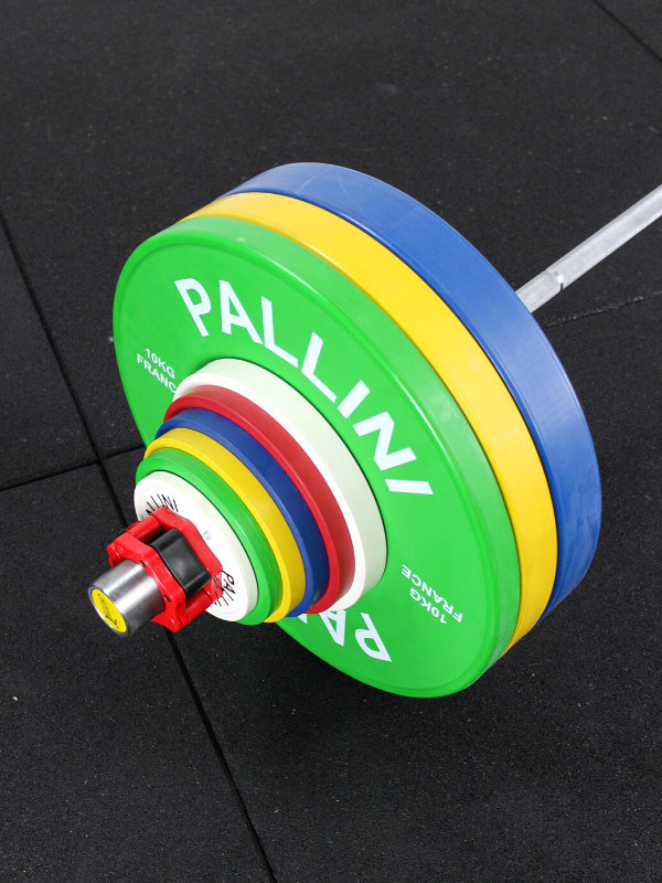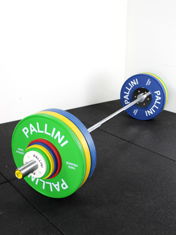 The [HERA BARRE] women's training bar for Cross Training with its Pallini competition weight plates . This pack is loaded to 130 kg.