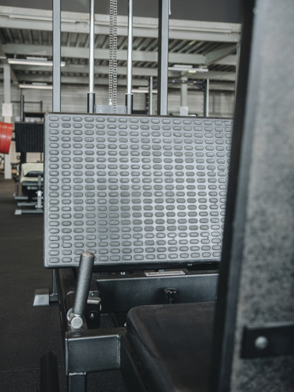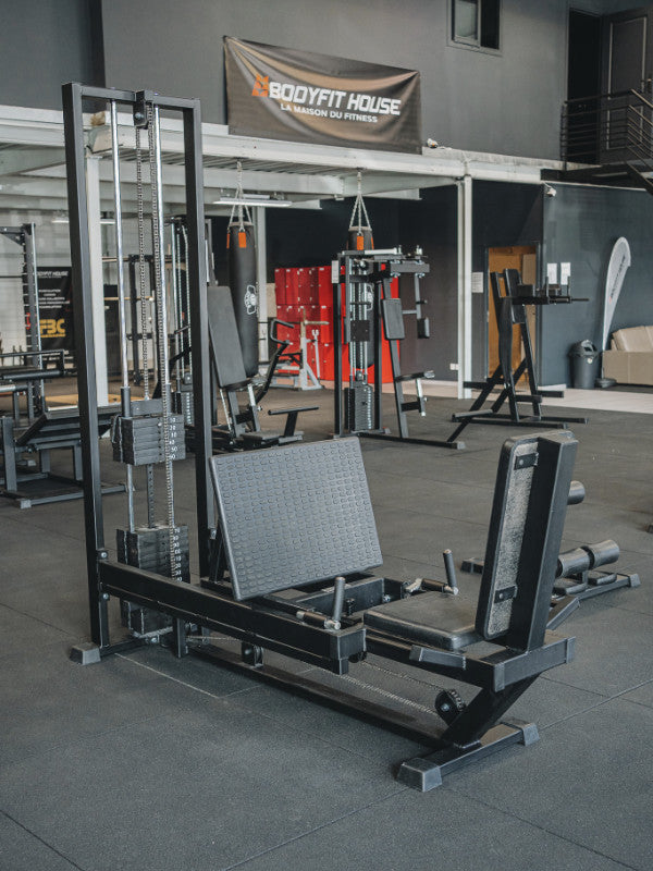 Lower body muscle work in a seated position: the work is done by pushing the legs on the platform and primarily targets the quadriceps and glutes, with some involvement of the hamstrings and calves.