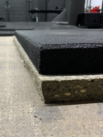 Acoustic and anti-vibration tiles measuring 100cm x 100cm / 30mm thick, manufactured in France. These tiles are installed as an underlay beneath rubber tiles.