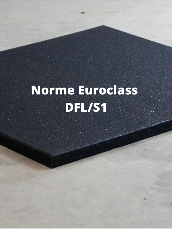 Dalles amortissantes en caoutchouc SBR recyclé avec traitement Anti Fumée DFL S-1 de 100cm x 100cm.