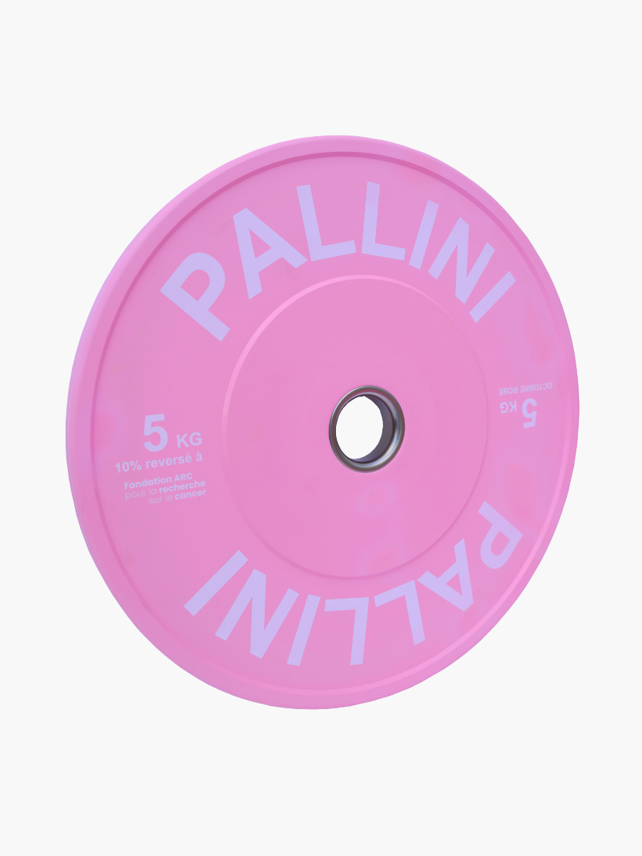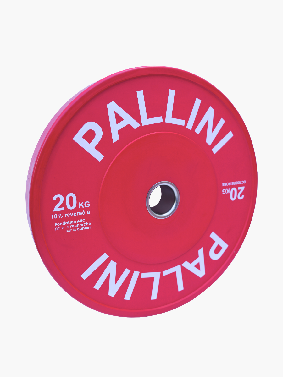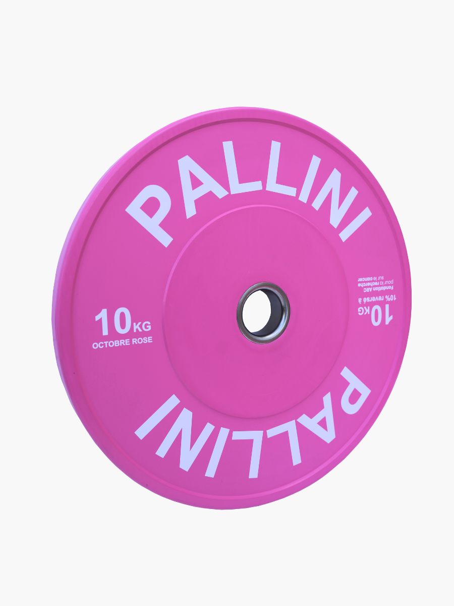 Performance Bumpers Plates PALLINI - OCTOBRE ROSE fabriqués selon les normes IWF. Ces disques offrent un rebond minimal et sont conçus pour la pratique intensive. Fabriqués avec du caoutchouc dur et un anneau en acier galvanisé, ils offrent une durabilité optimale et sont facilement reconnaissables grâce à leur couleur.