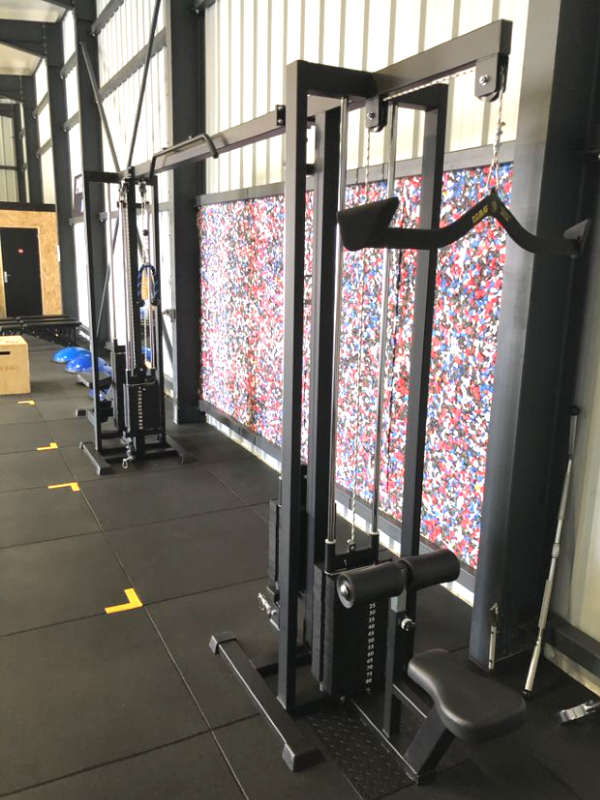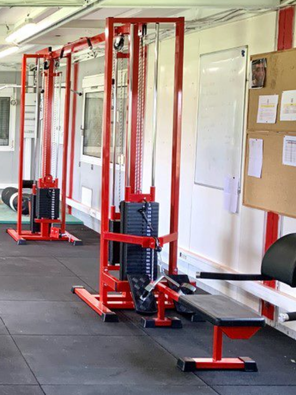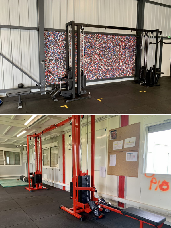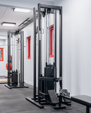 Poulie vis à vis avec poulie haute + poulie basse. Chaque poulie dispose de plaques de charges indépendantes.